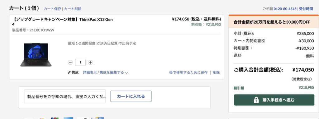 アップグレードキャンペーン対象のため、3万円引きとなり174,000円になりました。