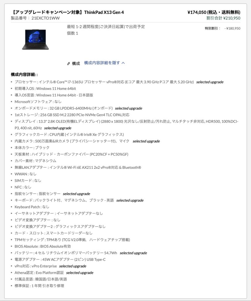 今回購入したThinkpad X13Gen4の構成内容が以下の画像です。